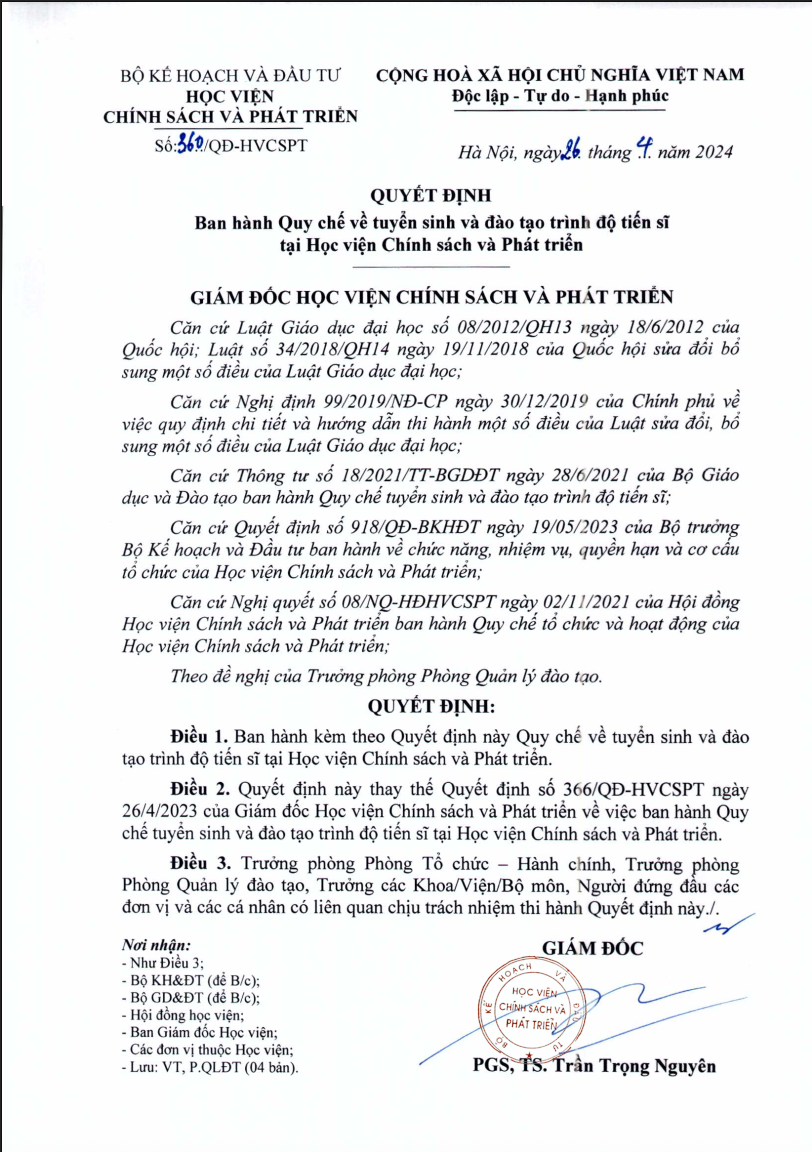 Quy định - Quy chếQuy chế tuyển sinh và đào tạo trình độ Tiến sĩ tại Học viện Chính sách và Phát triển Posted on Tháng 7 10, 2024Tháng 6 10, 2025 by Trần Hoàng Minh 10 Th7 Phụ lục đính kèm THÔNG BÁO: V/v lịch xét tuyển trình độ thạc sĩ đợt 1 năm 2024 Thông báo165 về việc tuyển sinh trình độ thạc sĩ đợt 2 năm 2024 (Khóa 13)