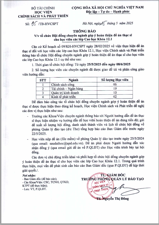Đào tạo thạc sĩ, Tin tứcThông báo tổ chức Hội đồng chuyên ngành góp ý hoàn thiện đề án thạc sĩ cho học viên các lớp Cao học Khóa 12.1 Posted on Tháng 5 15, 2025Tháng 5 20, 2025 by Lê Thị Cẩm Thơ 15 Th5 Thông báo về lịch xét tuyển sinh trình độ Tiến sĩ năm 2025 (Khoá 2) Thông báo lịch xét tuyển trình độ thạc sĩ đợt 1 năm 2025